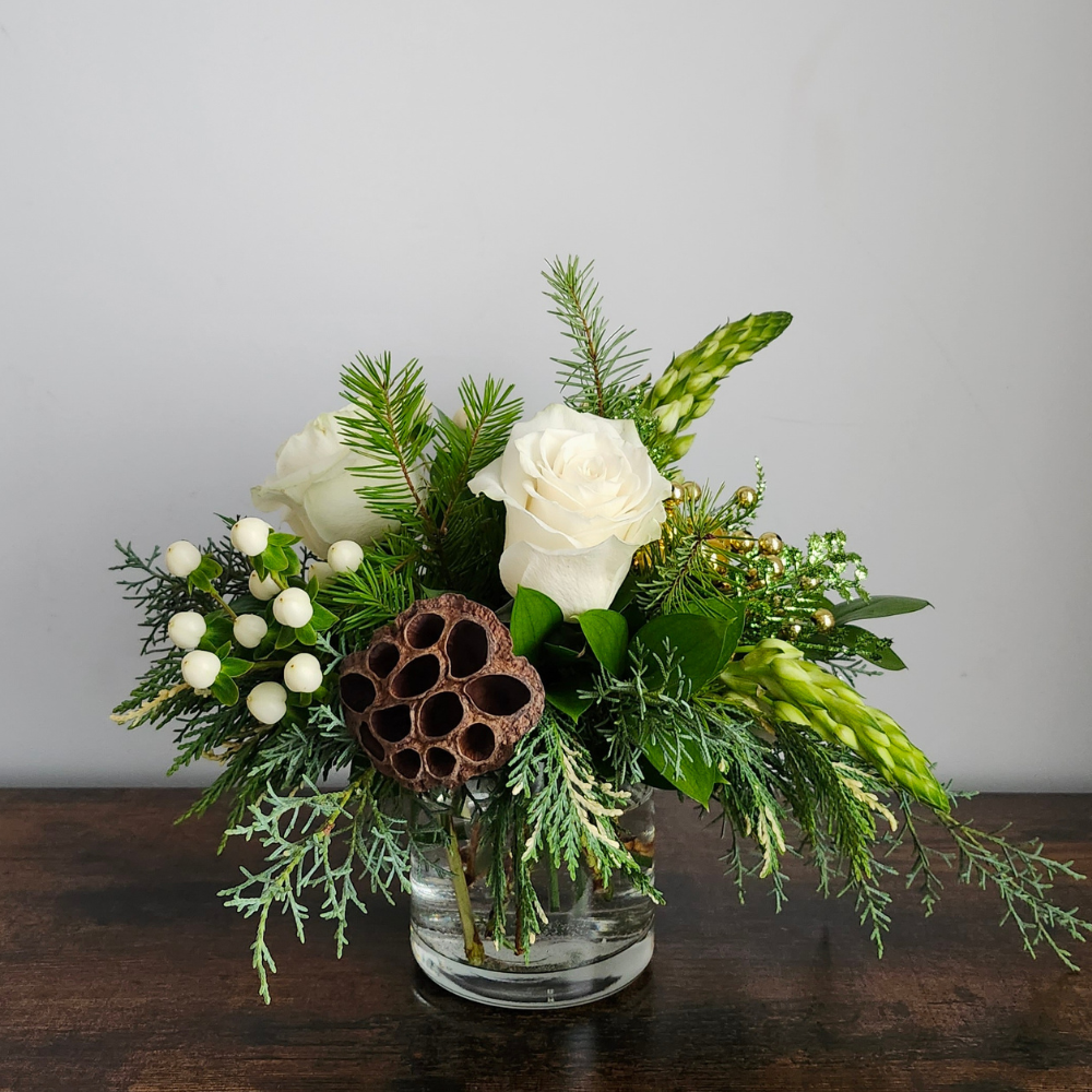 Joli montage floral festif dans d'élégantes nuances de blanc agrémenté d'une verdure de saison abondante et variée et de petites touches décoratives évoquant l'hiver et les Fêtes.