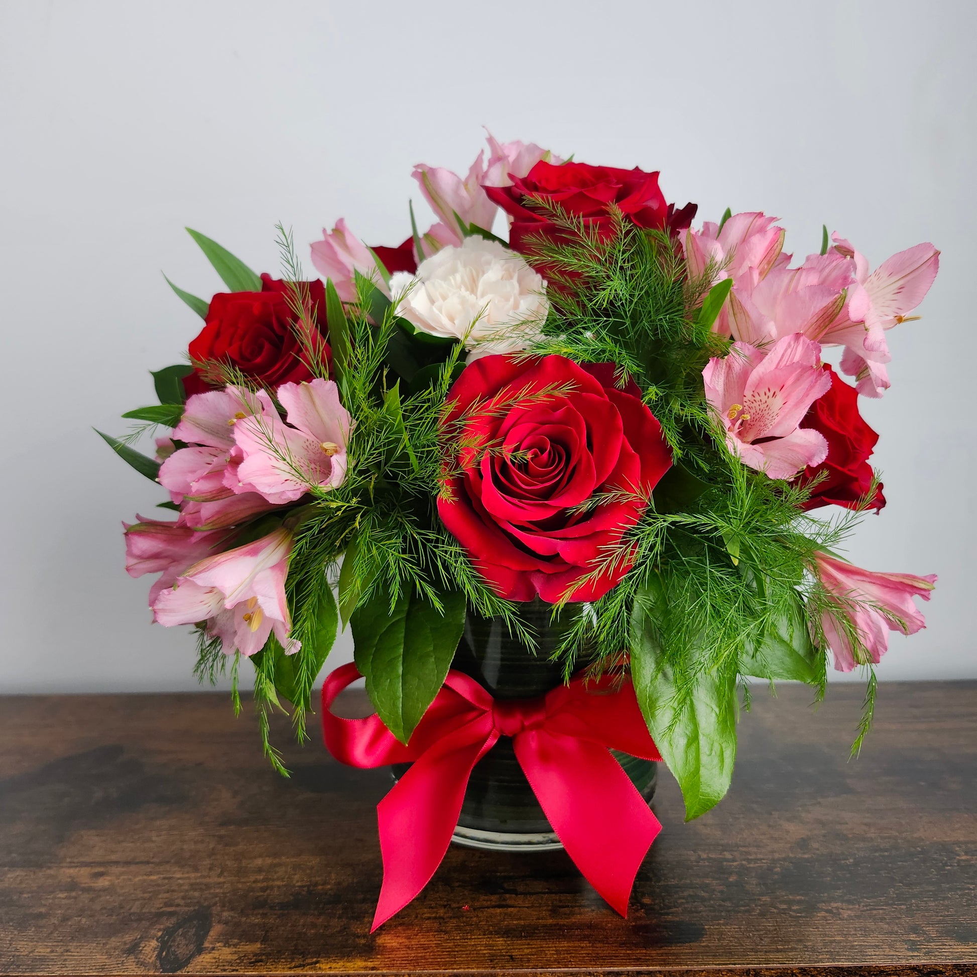 Décadent montage floral romantique contenant 6 ou 9 roses rouges selon le format choisi. Nos magnifiques roses sont accompagnées de fleurs dans des teintes de rose et d'une verdure abondante et variée pour vous offrir un montage luxueux et actuel.